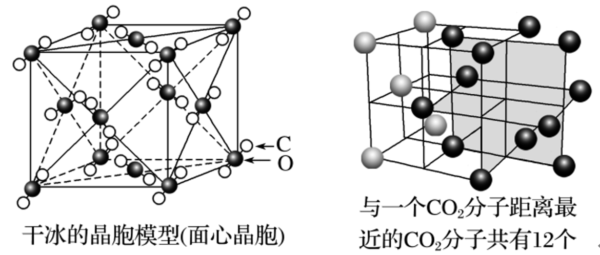 称为干冰,干冰也是分子晶体。 分子内存在 共价键,分子间存在 范德华力 , 的晶胞呈面心立方体形,立方体的每个顶角有一个 分子,每个面上也有一个 分子。每个 分子与 个 分子等距离相邻(在三个互相垂直的平面上各 个或互相平行的三层上,每层上各 个)